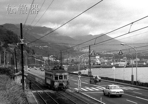 湯けむりたなびく別府の町並を背景に大分駅前行が両郡橋電停を発車する。別府市街からの複線の軌道線は両郡橋からかんたんまでの海岸線は単線に変わる。150形161号はタブレットを受け取って単線区間を進む。 大分交通別大線両郡橋 S47(1972)/4